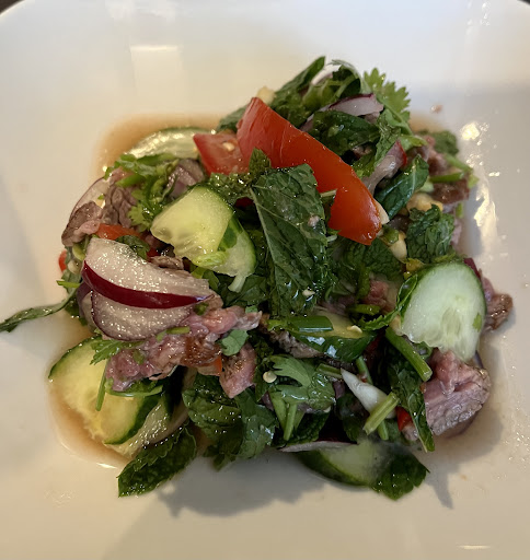 Er zijn Thaise restaurants die diepvries-talapia simpelweg als āvisā voor ⬠20+ op de kaart durven te zetten. Hier niet, ik bestel een hele dorade, subliem bereid op een nota bene drukke avond. Niet eerder at ik zulke goed bereidde vis bij een Thai! Een andere verrassing op de kaart blijkt Moe Yang (⬠16) te zijn, ook weer een gerecht dat je niet vaak tegenkomt. Het varkensvlees is gemarineerd, vermoedelijk geroosterd en wordt geserveerd op een spaarzaam bedje van kool met een schaaltje heerlijke fris-pittige saus.