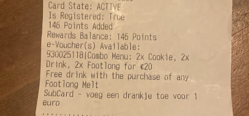 Read moreI use their app which is very buggy. It offered me a special of two foot longs, two drinks and two cookies for 20 eur. So I went there and ordered. They refused to honor the special citing the general terms state they are not part of the special (looking at the app terms it took three clicks and zooming in to see some tiny exceptions). They charged me 24 eur for only 2 subs.