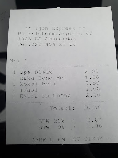 Read moreIk wilde bestellen en ophalen, dus Tjon Express gebeld. De telefoon werd opgenomen met alleen maar " hallo", dus ik wachten van er wordt vast wel achteraan gezegd van " met tjon express, wat wilt u bestellen", maar het bleef alleen bij "hallo" en zo hoort de telefoon niet beantwoord te worden als je een restaurant belt, echt heel erg onprofessioneel en niet klantvriendelijk! Ik heb toen nasi met bruine bonen en kip besteld en een nasi moksi meti. De nasi was niet lekker, was heel donker door teveel sojasaus, en de bruine bonen met kip was niet te eten, het was te dik en smakeloos. Ik bestel vaker bij tjon, maar nooit zo onsmakelijk gegeten deze keer! Het personeel die er werkt (veel jongeren) is ook onvriendelijk en onprofessioneel. Het eten was vroeger veel beter en lekkerder, maar wordt steeds slechter en slechter, Ik weet niet of ik weer af komt halen bij...