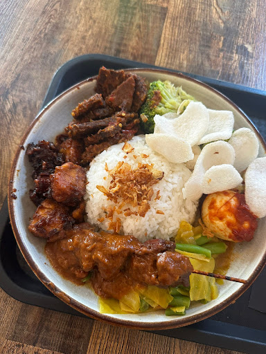 The plate I had was a feast: Fragrant rice crowned with crisp fried shallots, flavourful beef rendang tender to perfection, crispy ayam goreng with a delicious chili glaze, juicy satay smothered in rich, velvety peanut sauce, sayur lodeh for that veggie goodness, a sambal egg with deep, bold flavours, and of course, crunchy kerupuk to tie it all together.