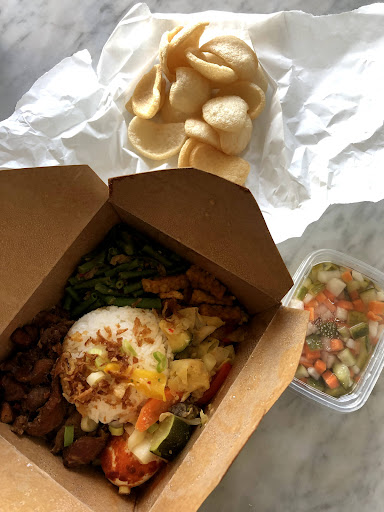 ordered takeout. ordered the Nasi Kuning Rames Mansoor and Nasi Rames Mansoor. Both meals came with a portion of prawn crackers and a small slice of the pandan spekkoek cake.