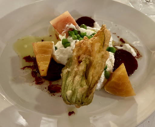 We ordered from their lunch menu: two ravioli stuffed with potato, pecorino and mint served with artichokes and a mussel spaghetti with courgette, garlic and chillis to be washed down with a bottle of Tenuta white wine (starts at €24). The plump raviolis arrive in a modest lunch time portion filled with smooth potato filling supported by the creamy pecorino which is all brightened by a tingling mint that makes the dish light and summery. The well seasoned spaghetti with mussels is a more substantial portion of slick pasta with a scattering of mussels in their shell but an assertive punch of chillis renders the garlic almost indiscernible. It’s not a spicy dish but if you do not like spicy food then this will come as a surprise. Our group was divided as to whether the pasta was al dente or just undercooked: my view is it needed a minute more in the water. The spaghetti was pleasant but could benefit from more mussels especially those taken out of their shell. A hint of lemon would brighten the dish more.