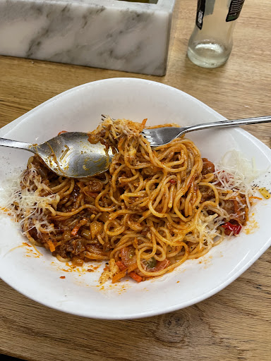 Read moreI guess that’s the only time I am sorry that my phone camera is so good that it can’t show the whole disaster. The photo looks much nicer than the reality. It was the worst pasta in my life. Overcooked, cold, dry of being on air or under the heating lamp, sticked to each other. You could even separate the spaghetti from each other. The veggies in Bolognese sauce were crunchy (so even the sauce wasn’t cooked properly). The atmosphere is another disaster. I understand that horeca is going through hard times as I work in hospitality too. Tables are dirty and they stay like this for 30 minutes at least. The staff doesn’t know what guests order. Waiters were constantly walking around the floor and asking every table if someone ordered this dish or not (no wonder the dishes come cold). Saw pizza man delivering orders to the tables. Saw guests going down to pick their order as they couldn’t wait anymore. I am writing this review not only for the customers but for management of the restaurant. It’s super dirty in the restaurant and the atmosphere is chaotic. The staff doesn’t know how to act and plan their work. Keep walking around bringing plate by plate separately (and it’s going down and up the stairs!) when you must teach your staff how to use trays for god’s sake. Your waiters bring drinks, straws, cutlery and clean the table not all at a time but come every two minutes! So it’s four times they come to the same table without any real need while the restaurant full of people and you lack staff (and it’s for every table!!!!!). Other tables are full of dirty dishes so new customers can’t take a seat. I was watching this chaos and then I got my awful food I wasn’t even going to finish. At least train your staff before letting them begin. I never blame the staff who has no experience but the management who doesn’t care about training their staff....