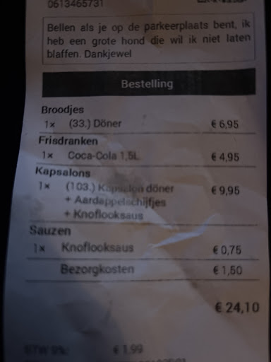 Read moreWanneer ik om 3 uur ‘s nachts met een lamme kop een snack uit de muur trek verwacht ik geen haute cuisine. Maar wanneer ik op een zondagavond döner bestel verwacht ik wel dat het warmer is dan de toiletbril waar net iemand voor jou op zat. Na ruim 20 minuten heeft de bezorger het adres weten te vinden overhandigde 2 klamme plastic zakken. De bakjes saus, die hij door alle spanning op de stoel laten liggen, werden na een telefoontje een half uur later gebracht. Het eten was niet gelabeld dus met 10 man graaien in lahmacuns voelde als Black Friday in Detroid. Het eten zelf? Daar ga ik niet eens de moeite voor nemen om dat te schrij.