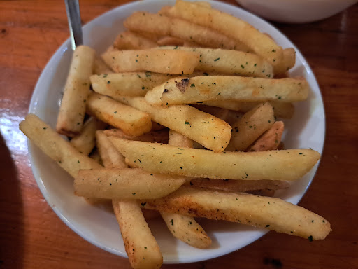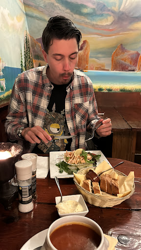 Beetje een smoezelig restaurant met een donkere stoffige uitstraling. Niet zo zeer een restaurant waar ik vanaf de buitenkant snel naar binnen zou stappen. Toch krijgt het goede reviews dus dit restaurant moest ik toch ook een keer uitproberen. De man die ons naar het tafeltje bracht was een beetje gehaast maar wel heel vriendelijk. Het interieur is niet mijn smaak, maar het past er wel echt bij. Het is echt een eetcafe. Vooraf kregen we een mandje met brood van het huis waarvan de saus werd geserveerd in een schelp wat er toch weer wat leuker uitziet dan een gewoon bakje. Omdat we kozen voor een groot voorgerecht (na het brood) was het de vraag of we nog wel een heel hoofdgerecht op zouden kunnen (we kwamen net terug van een chocolade festival). Wij vroegen daarom of een kinder portie ook mogelijk was. Dit was geen probleem. We konden zelfs later toch nog wisselen mochten we toch meer honger zouden hebben, maar het was meer dan genoeg. Het eten was qua niet bijzonder maar helemaal prima. Voor een toetje zaten we te vol. Bij het afrekenen werd nog gevraagd of we nog een kopje koffie of thee wilde. Dit wilde we niet, maar heel lief dat dit werd aangeboden.