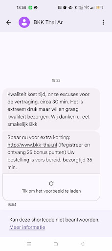 Worst service ever! 3.5 hour wait for food! This was by far the worst customer service I've received from a food provider in years! We order our food two hours before it was supposed to be delivered. Half an hour AFTER it was due to be delivered we received a text saying the food would be there in half an hour. An hour after we received that text our food arrived. This was an hour and a half late!! During this time we can called multiple times, no-one answered the phone. The next day I sent BKK Thai an email. I subsequently called three times and spoke to the service lady about my email asking for a response. I was told I would get a response in the next week. Surface to say I have never received any contact from BKK Thai. I am exceptionally disappointed in this service. This is not the service expected of a reputable food...