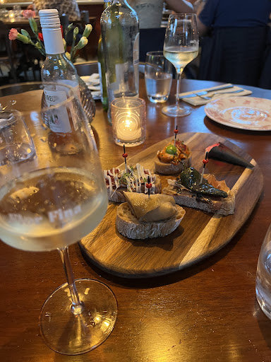 Read moreSuper mooie zaak, leuke ambiance. Je kunt weliswaar niet buiten zitten maar door de constructie met een pui die omhoog schuift heb je het idee buiten te zitten. Maar goed we komen dus om te eten. Ontvangst was prima. De kaart wat vaag, een paar verkreukelde blaadjes op een plankje met een clipje. Het gevolg hiervan was dat een van de tafelgasten wat bestelde van zg lunchkaart omdat ze niet kon zien (door het clipje) dat het de lunchkaart was. Jammer, maar natuurlijk geen groot issue. Geïnteresseerd in de Pinchos, maar daar was/is geen kaart van. Je zou daarvoor mee naar de Pinchosbar kunnen lopen om wat uit te zoeken. Helaas was de Pinchosbar gesloten. De medewerker heeft vervolgens in de keuken nagevraagd wat er te krijgen was. Er waren 5 verschillende Pinchos te krijgen die we alle vijf geprobeerd hebben. De Pinchos met Ham en Ansjovis en met Humus en geroosterde Paprika waren fantastisch. De andere drie waren wat fantasieloos. Later op de avond hebben de Ansjovis en Humus Pinhos nog een keer besteld, maar nu was het niet zo fantastisch. De verhoudingen klopten niet, nauwelijks Humus en Ansjovis en veel teveel dressing waardoor deze de smaak totaal overheerste. Conclusie geen constante kwaliteit. Als hoofdgerechten het schaal en schelpdieren plateau, de bouillabaisse, risotto, saté, en nog enkele andere gerechtjes (die weinig indruk hebben gemaakt. De schaal en schelpdieren waren op zich goed maar veel te koud geserveerd, de garnalen waren half bevroren. Voor de rest prima. De bouillabaisse was wel smakelijk, alleen zaten er nauwelijks vis/schaaldieren in en voor 10 euro wel een heel klein kommetje. De risotto was helaas niet gaar, de saté daarentegen was de hit van de avond en erg lekker. Dan nog even een opmerking over de huisgemaakte friet. Pas na 4x vragen kwam deze, ondertussen hadden we alles al op. Een schaaltje met wel geteld 15 frieten voor 5 euro..