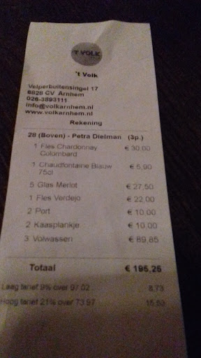 Wij bestelden bij aanvang 1 glas rode en 1 fles witte wijn (dat werden uiteindelijk 2 flessen witte wijn en 5 glazen rode wijn) en we wilden daar graag water bij. Kraanwater "hadden" ze niet. Zeg dan dat je dat niet wil schenken denk ik dan. We hebben uiteindelijk met 3 man voor bijna 200 euro gegeten en gedronken, kan daar dan echt geen gratis water vanaf? Dat vind ik echt een minpuntje. Ik snap dat er gasten zijn die alleen maar water drinken, maar bij ons was dat overduidelijk niet! Hiervoor dus maar 3 sterren.