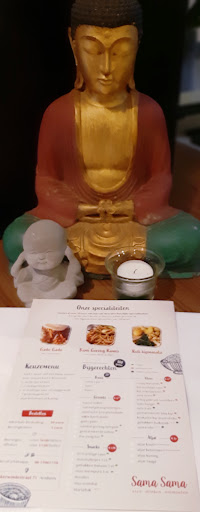 Gisteren voor het eerst bij Sama Sama een maaltijd gered via too good to go.Ik had al wel eerder via via gehoord dat er 'iets van een restaurantje', 'nu met afhaal' onderin op de begane grond in hoge gebouw gelegen aan de Akkerwindestraat zit, waar je lekker kan eten o.a gerechten uit de Indische/Javaanse keuken of met een Indische inslag. Ik was aan het speuren naar producten en maaltijden die gered konden worden via de app van Too good to go en zag ineens een nieuweling ertussen staan en dacht gelijk....die gaan we redden. Een Magic box gereserveerd en later opgehaald.Het was even kijken waar de precieze locatie van Sama Sama is maar Sama Sama zit dus ook echt binnen in het hoge gebouw, op de begane grond rechts. Mijn eerste indruk was gelijk goed.nette keuken waar je gedeeltelijk in kon kijken en er hadden 2 dames, volgens mij ook 1 Indische dame een bestelling gedaan die ze op kwamen halen.Ik werd door een vrouw vriendelijke te woord gestaan en kreeg mijn Too good to go magicbox.Ondertussen viel mij oog op andere gerechten op de menukaart en heb ik ook nog zelf voor erbij een menu besteld en samengesteld voor afhaal en kreeg hierbij genoeg en goede uitleg. Voor een maaltijd/menu kan en moet je vooraf telefonisch een bestelling plaatsen of een Magic box reserveren en dan daar afhalen. De Magic box bestond uit 1 medium kippepoot ketjap, atjar kuning en een portie macaroni en kaas met een Indische inslag.Bij een Magic box via Too good to go weet je van te voren niet wat je krijgt en ik was verrast door macaroni die overigens goed van smaak was maar niet helemaal mijn 'ding' ( wel die van mijn zoontje) maar de kip en atjar waren echt heerlijk. Het door mij samengestelde menu was zeer ruim voldoende eigenlijk wel voor 2 normale eters en smaakte voortreffelijk.Je krijgt er overigens ook kroepoek en huis gemaakte sambal bij.De box en het menu krijg je wel koud mee om thuis op te warmen maar de groenten het vlees enz apart verpakt of in een zakje gelegd zodat de smaken niet in elkaar overgaan.Ik hoorde dat via too good to go ook box bij Sama Sama Magic tasting(Proeverij) beschikbaar is en na het proeven van de Magic box en het menu samen met mijn man en zoon zodra in de app beschikbaar, direct 2x magic tasting gereserveerd voor vanavond, ook voor mijn buurvrouw(zij wilde ook graag na mijn verhaal de gerechten uitproberen).Het is een lange review geworden maar ik ben dan ook erg enthousiast over de smaak en de hele entourage.Later ook op de website gelezen en gehoord over de maatschappelijke betrokkenheid van Sama Sama bij de gemeenschap in hun omgeving en het samenwerken met arbeidsbeperkten. Mijn/onze conclusie: Zeker de moeite waard eens uit...