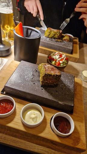 Wir haben uns für Rumpsteak auf dem heißen Stein (Hot Stone) entschieden, denn wenn man schon mal hier ist, dann sollte man das auch probieren. Das Fleisch - von bester Qualtität - kommt gewürzt aber roh. Man schneidet Stücke ab und brät sie nach Wunsch. Tipp: das Fleisch zeitnah wenden, wenn es an den Tisch kommt.