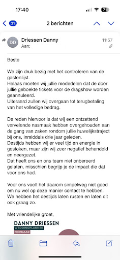 Bovendien heb ik alle mailcommunicatie tussen jullie gelezen. Daarin blijkt juist dat u en uw team zelf erkennen hoe ernstig en verontrustend de uitlatingen destijds waren. Zij hebben ook aangegeven dit ontzettend erg te vinden, is pas bekend geworden bij hun doordat jullie dit hebben vertelt aan hun na het annuleren van hun bruiloft bij jullie. Als u dit zelf zo erg vindt, is het vreemd dat u nu onterecht schade veroorzaakt aan mensen die hier niets mee te maken hadden. Misschien is het goed dat u en uw team eens in de spiegel kijken voordat u ongefundeerde beschuldigingen uit en besluiten neemt die onschuldige gasten schaden.