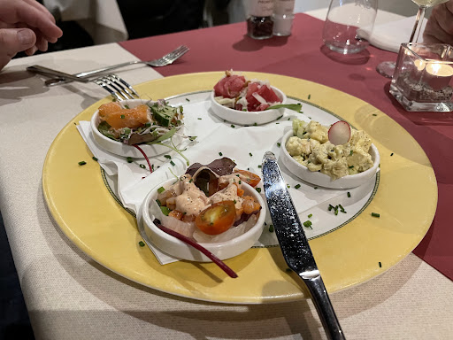Read moreMatig, eenvoudige gerechten waar de chef weinig aandacht aan besteed. Wij hadden het duo van Hazenpeper en wildzwijnfilet. De filet was erg droog en er lagen maar 3 mini blokjes hazepeper op het bord. Naast de stofpeer lag er geen enkele groente op het bord. De Hazenpeper lag op een bedje van puree en als bijgerecht kregen we frietjes en aardappelkroketjes. Wij hadden als voorgerecht en nagerecht de proeverij genomen. Eigenlijk maakt de Chef zich er erg makkelijk vanaf. Gerookte zalm, uit een pakje, garnaaltjes, uit een pakje, kipfilet nou misschien heeft hij die zelf gemaakt en Carpaccio ook uit een pakje. Dus nergens iets waarmee hij kan laten zien wat hij kan. Nagerecht hetzelfde verhaal, profiterol, spekkoek, bolletje vanille ijs, alles gekocht alleen de chocolade mousse is misschien gemaakt. Zelfs de slagroom kwam uit een spuitbus. Het was voor de prijs niet echt wat ik ervan verwacht had. De dame van de bediening was erg vriendelijk en correct. Voor ons niet voor herhaling vatbaar. Dit kan ik thuis ook en dan beter...