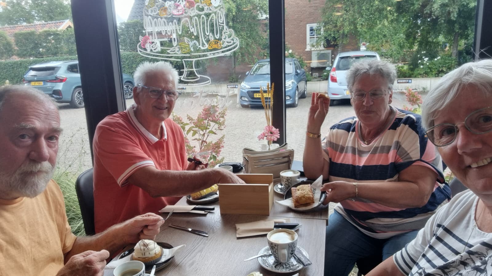 Read moreZaterdag 26 oktober........Zonnig en warm vandaag...een rij wachtenden bij het terras....de rechterhelft is dicht, afzetlint ervoor en 2 krukken, dan zie je goed dat je er niet mag komen...nee hoor gaat zeker niet open anders zijn we vanmiddag te laat ivm. opruimen, wel worden de losse stoelen naar links gebracht....heerlijk hutje mutje.....wij zitten dus om de hoek op straat naast het fietsenrek met onze gebak en koffie in een kartonnen bekertje, een vorkje mochten we dan wel lenen.....wat een Veluwse...