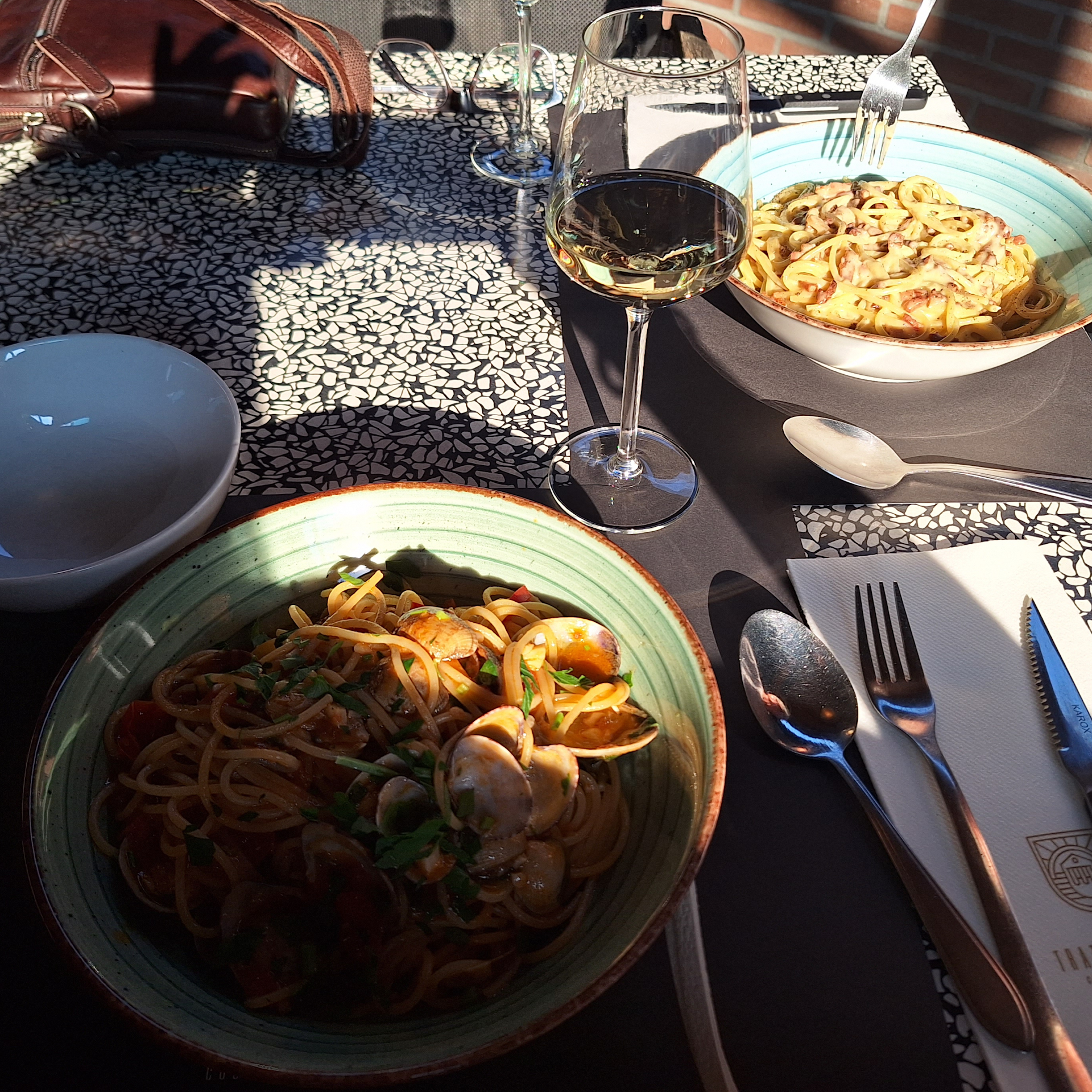 Eten: de truffel-ravioli was vooral heel zout (van de parmezaanse kaas in de roomsaus?) Ik heb heel nadrukkelijk gevraagd of er échte truffel in zit, of dat t -pasta of -crème (deze dingen staan namelijk bij de pizza's vermeld) was. Nee: échte truffel...... Dat was niet helemaal eerlijk. Jammer en tegenvallend.