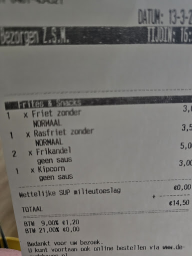 Gewone frieten waren goed , rasfriet was veel te lang gebakken en de shoarma was veel te zout gekruid hebben het helaas weg gegooid.