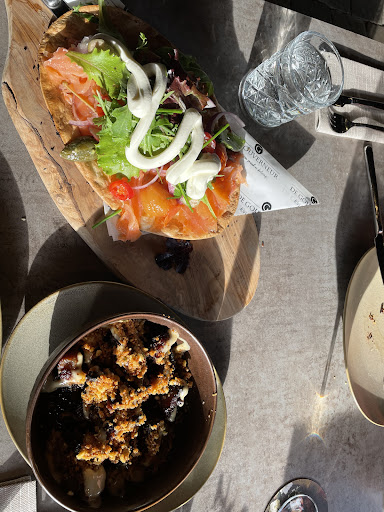 Read moreIk was als vegetariër erg benieuwd naar dit restaurant omdat het voor Bergse begrippen veel vega opties heeft en reclame maakt voor de plantaardige 3D geprinte steak. Echter vandaag door Krabbefoor een beperkte menukaart, zonder de spannende steak. Begrijpelijk dat er vanwege een evenement wordt gekozen voor een beperktere menukaart, echter hebben we dagen van te voren gereserveerd en is het jammer dat we pas hoorden dat het menu kleiner was na het eerste drankje genuttigd te hebben. Nog steeds wel twee vega opties bij zowel voor- en hoofdgerecht. Als voorgerecht gekozen voor de tomatensalade met burrata, helaas was deze erg flauw. Vleestomaat met cherrytomaatjes en 1 verdwaalde zongedroogde tomaat, waarbij de laatste hier echt de smaakmaker had moeten zijn. Burrata, tomaat en sla hebben van zichzelf weinig smaak, een gezouten nootje en bijv balsamicocreme hadden niet misstaan. Als hoofdgerecht gekozen voor caponata met fregola. Gerecht kwam heet uit de oven, maar hier was sla opgelegd wat algauw verlept was door de hitte van de caponata. Daarnaast was de fregola vergeten en zat er het kapje van de courgette in. Al met al leek weinig liefde in deze gerechten gestoken. Dit wel aangegeven bij de bediening, dus hopelijk heeft de volgende vegetariër een betere maaltijd. Mijn wel vleesetende man heeft goed gegeten, maar was ook niet enthousiast genoeg om nog een keer terug te...