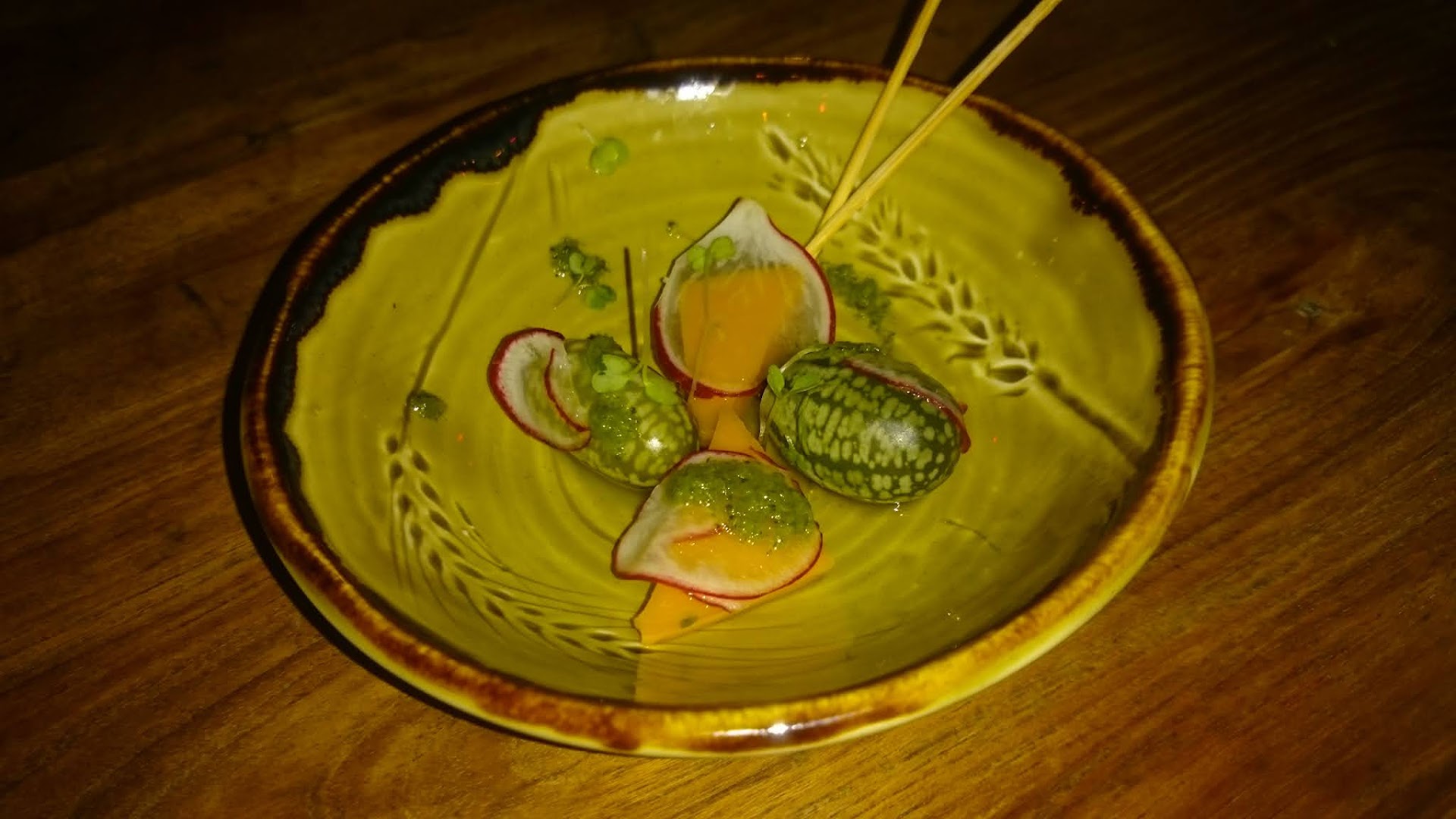 4: Quinoa, local spinach, mashed and fried pumpkin, coquillages .. All in a smoked pot which the open for you at the table. Super entertaining!!
