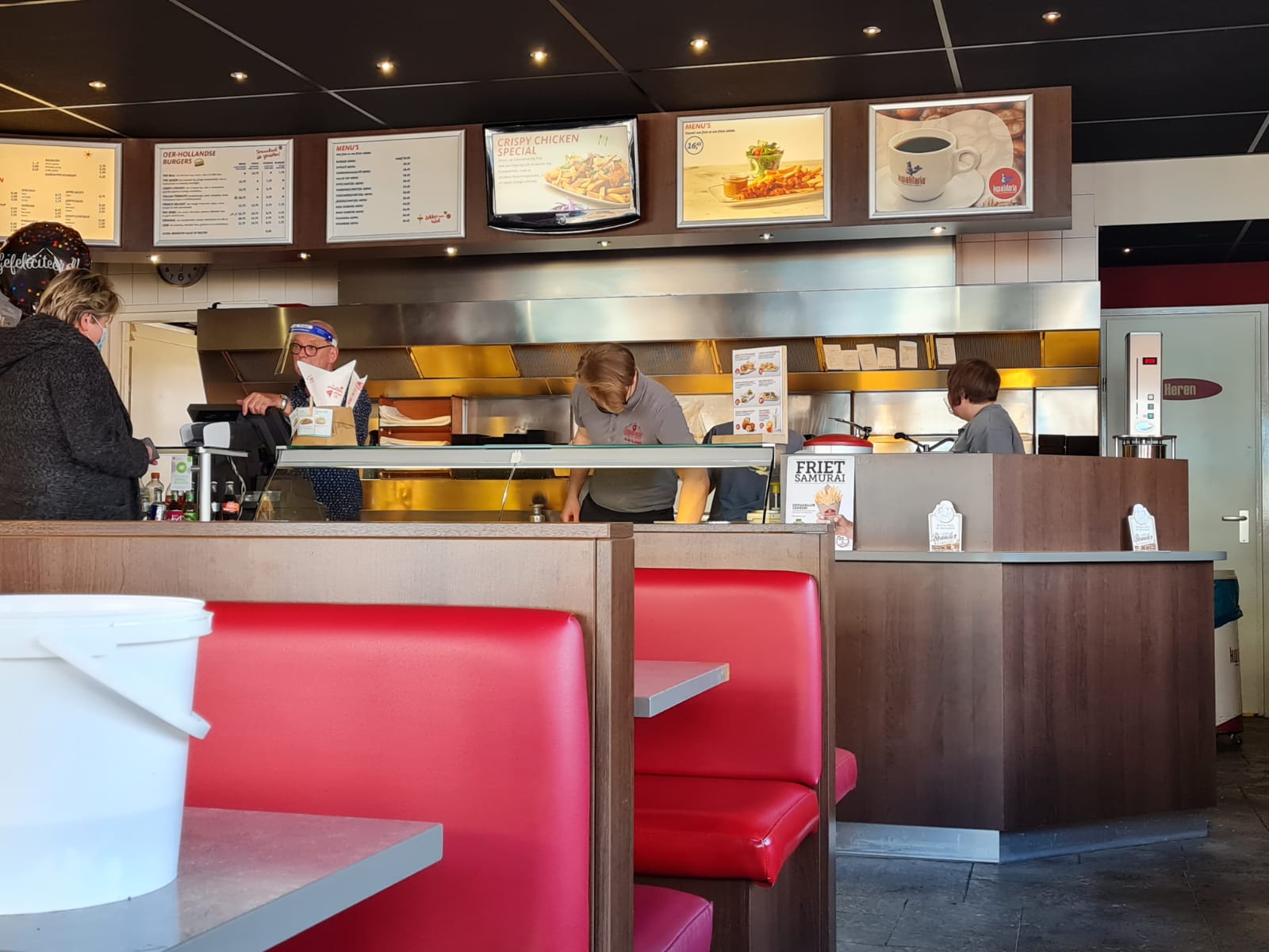 Verder is het één grote chaos achter de balie. Lopen 5 of 6 jongeren rond te rennen die elkaar continue naar van alles moeten vragen. Niemand die de leiding heeft en de boel aanstuurt.