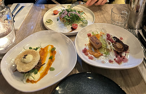 Kalfsvlees - Bland tasting meat, not much of a flavor Tompouce van brie - Very delicious highly recommend Coquilles met buikspek - extremely small portion with not much flavor other then the pork belly