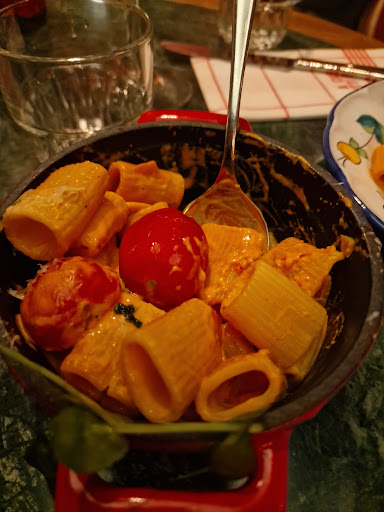 The food did not disappoint either. I had risotto crochets as anti pasti and they were delicious. We had a Margherita pizza which is super good if you eat it warm. Once it gets cold is meh. The vodka rigatoni were super drlish. Totally recommend. And we had some oven potatoes with Parmigiano and parsley. Very good. The white Italian wine is good. The cocktails are meh. Not so great. The price is also OK. If they manage to hire more people the place...
