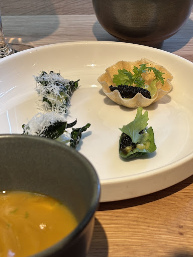 De middag begint met een reeks amuses die elk als een klein kunstwerkje op tafel verschijnen. Een subtiel smaakbom soepje, een verrassend visgerechtje, en uiteindelijk een prachtige moot vis als hoofdgerecht. Elk gerecht is puur, eerlijk, en vol van smaak, zonder onnodige toevoegingen. Tot mijn verrassing werd er ook volledig rekening gehouden met mijn allergieën – een detail dat ik enorm waardeer.