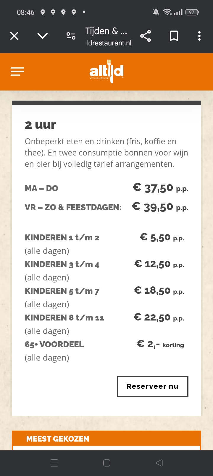 Bij binnenkomst om 17:30 netjes ontvangen alleen konden ze onze reservering niet meer vinden na wat zoeken bleek dat ze ons al hadden door gestreept maar alsnog gewoon netjes een tafel gekregen.