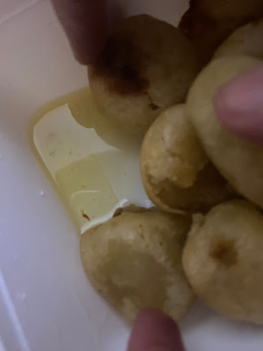 Terug thuisgekomen direct gaan eten. We halen de Loempia uit de verpakking, die was verbrand en aan de verpakking vastgeplakt en de Ku Lo Yuk dreef in het vet. We hebben het geprobeerd, echt waar. Maar de balletjes die niet sompig waren van het vet waren zo hard dat je ze niet kon doorbijten. En de loempia smaakte echt verbrand.