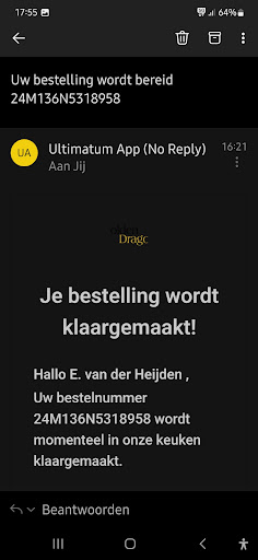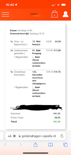 Na mijn bestelling heb ik veel reviews gelezen. Ik ben mij rot geschrokken van de vele slechte reacties. Het hoofdprobleem bij dit restaurant is kennelijk de aflevertijd. Als je al van tevoren weet dat je de beloofde tijd nimmer gaat halen, wees dan reeeler met deze tijd en doe geen loze beloften richting klanten. Het lijkt mij dat je als restauranthouder juist liever meer tevreden klanten wil hebben dan ontevreden klanten. En als de aflevertijd te lang duurt, het zij zo. Je kan je altijd excuseren als het bijv. erg druk is met een mailtje of telefoontje.