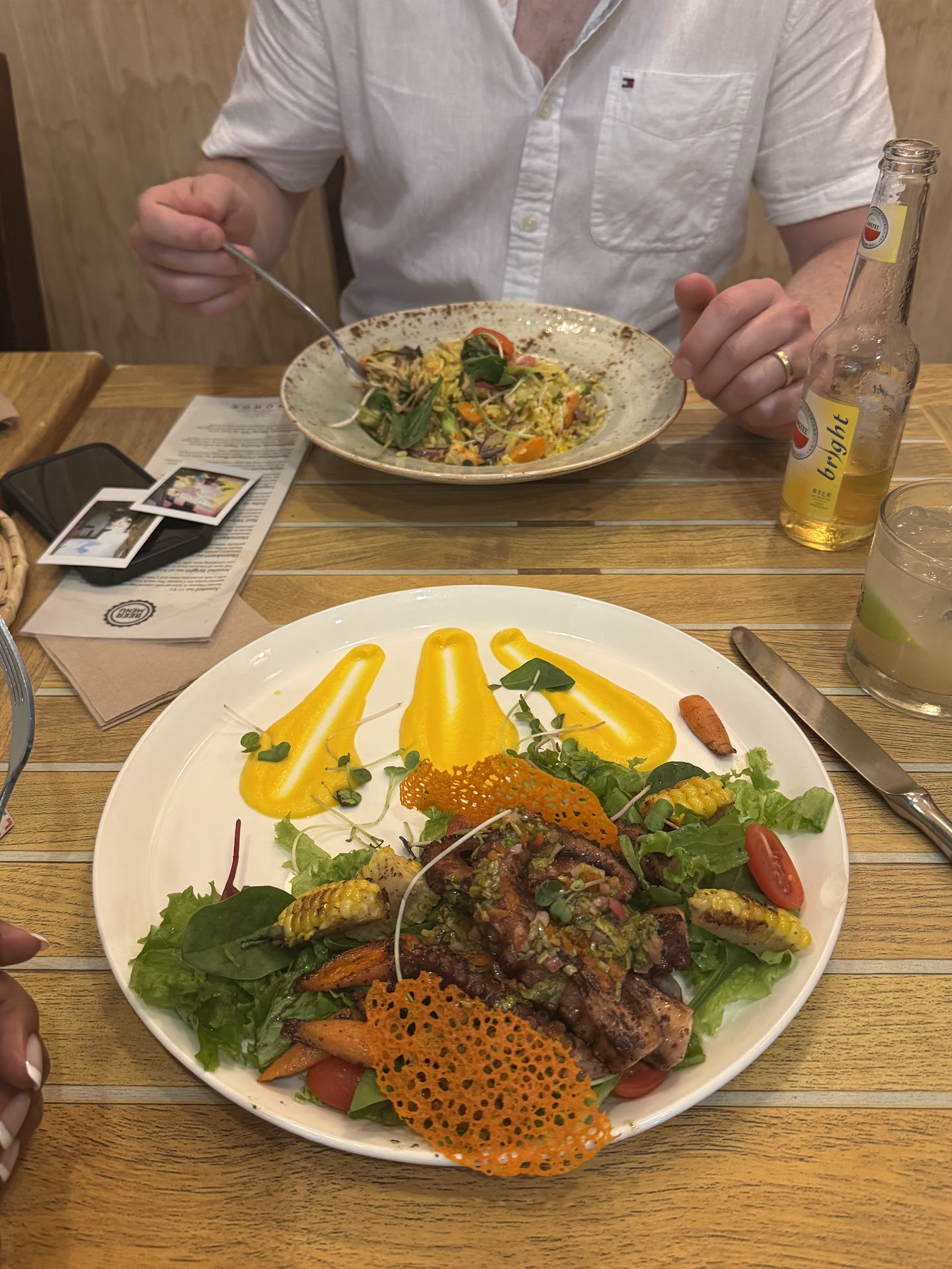 Read moreBring your own napkins... Fun and relaxing outdoor cafe with plenty of seating and excellent Wi-Fi. Fairly priced and well prepared food with good attention to detail and style. My medium rare ribeye was tender despite being over cooked. I usually like a blue steak... My wife's red snapper was quite enjoyable, not over cooked and flaked as it should. Alcohol prices are in line with the rest of the island. You will need to bring your own napkins. All they offer are cocktail napkins and not many at that. Also make sure your wait staff can understand you. We had to do some verbal josteling before someone was able to properly take our order. Music starts around seven... If you find this review helpful, please...
