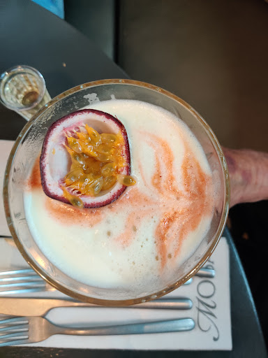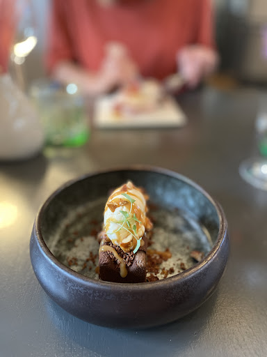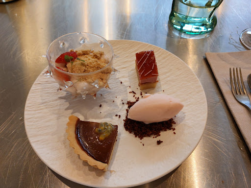 Maar veel vervelender was een feest achter in de zaak, wat ten koste ging van ons diner. Wij zaten naast de stalen deuren die met veel geluid continu open en dicht gingen om feestvierders en bediening door te laten. Daarbij zat mijn tafelgenoot direct in de discolampen te kijken. Toen de bank naast ons vrij kwam en we vroegen of we hier mochten zitten, gaf de bediening aan dat er nog mensen aan de bar zaten te wachten op een tafel. Dit bleken 2 personen te zijn, waardoor we ons afvroegen waarom niet wij (met reservering en een klacht tav een onrustig diner) op de bank mochten zitten en deze gasten op onze plek. Later, ten tijde van ons dessert, werd ons nog wel een plek aan de bar aangeboden en onze koffie hebben we uiteindelijk wel meer ontspannen op de bank, iets verder van het feest, kunnen drinken.
