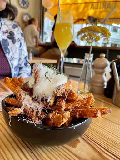 Read moreWe visited Lakila for the first time yesterday afternoon and enjoyed the vibe and food. If you go between 14:00 and 16:00, you get a discount on selected drinks. We were lucky to be there just a few minutes before 16:00. We tried Italicus spritz and mimosa and they were good. We also ordered sweet potato fries which I think was a bit expensive, but quite a treat for the eyes. The cheese over fries was particularly nice. We loved croquettes with geitenkaas and ordered it again. We saw some costumers with a nice white drink and upon asking the staff about it, found that it was sgropinno (lemon sorbet with vodka). We ordered it and enjoyed it thoroughly. It is perfect for hot weather. I also had a pastel de nata and i found it a little less sweet for my liking. Overall, the staff is friendly and the food is nice. I have always found Lakila full during lunch and dinner time, but we were lucky to find it relatively empty (especially inside) which is what we find comfortable during...