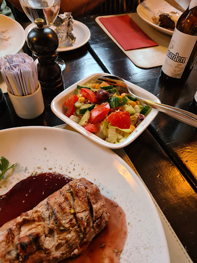 We ordered bread with garlic butter and chimichurri. Chimichurri looked more like a salsa than a chimichurri, there was only a bit of parsley which was ratherdisappointing. I had the pork fillet with red port sauce (cerdo a la Buenos Aires) the sauce was tasty and the meat was well seasoned, but it was only lukewarm almost on the cold side. It'd be better if the plates were warmed up perhaps? The main plates are served with potatoes (fried or baked) sauce and a small salad. Baked potato was good but the side salad was dry, it needed a bit more dressing. The rest of the group ordered tenderloin at different levels of doneness, and in general, they were all satisfied with the meal.
