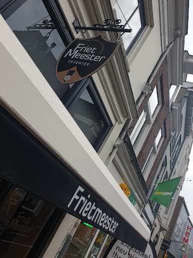 'De beste friet van Overijssel', is de wervende tekst die de eigenaren trots hebben opgehangen in hun zaak. Dat het de beste friet van Deventer is, wil ik best geloven. 'Ambachtelijk bereid', zoals dat heet. De patatsnijder (friet is iets voor Brabanders) staat pontificaal op de toonbank en de aardappels liggen netjes in gelid in kistjes op hun beurt te wachten. Zoals gezegd: prima patat! Er wordt ook gedacht aan de gezondheid, want: zuinig met zout. Nu heb ik een iets breder referentiekader dan Deventer, aangezien ik doorgaans de ambachtelijk patatbakker Puur Zuid in Almelo bezoek. De overeenkomsten waren treffend: identieke verchroomde standaards voor de puntzakken, brandermayo beschikbaar, een koelkast waaruit je zelf je flesje drinken kunt pakken en betrokken bediening (alleen: mag er de volgende keer een lachje af? Al is het maar een kleintje?). De patatten smaakten er overigens niet minder om. Toch, noem het chauvinisme, vind ik de patatten uit Almelo nèt iets lekkerder dan die van de Frietmeester in Deventer. En in Deventer miste ik deerlijk de pittige vegetarische bamischijf. Die zit niet in het assortiment. De genuttigde, volgens Frietmeester zeker niet gewone bamischijf, vond ik dus een beetje flauw. Hij was ook zo goed als vegetarisch, hoewel dat niet op het krijtbord werd vermeld. Maar goed, als je in Deventer bent voor een patatje: bezoek Frietmeester (ben je in...