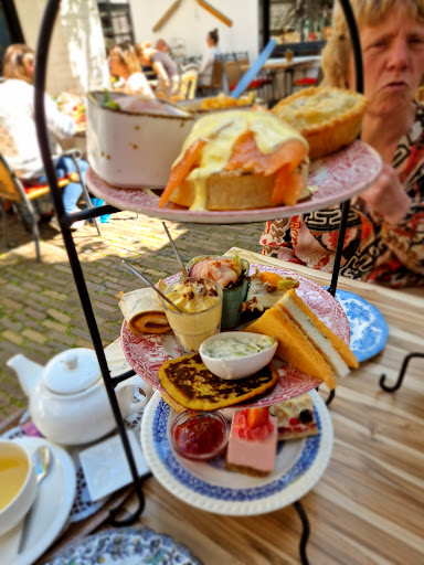 Read moreLocatie locatie locatie....daar betaal je voor. Super leuke plek in de binnenstad van Deventer. Bij mooi weer een sfeervol terras. Bediening is vriendelijk. Er is keuze uit verschillende soorten high tea. Echter als je glutenvrij moet eten kom je bedrogen uit. Weliswaar heb ik genoeg gegeten, de smaak liet te wensen over. De prijs -kwaliteitverhouding is ver te zoeken. Eigenlijk was op de salade met chorizo na alles gortdroog. Gelukkig zat er clotted cream en jam bij, zodat het cakeje, de brownie en de scone nog enigszins te eten waren. Sterker nog: de scone was niet te snijden, zo hard. Bij het afrekenen melding gemaakt van het feit dat de prijs wel hoog was voor de geleverde kwaliteit. Hierop werd gereageerd dat ik dat tijdens de high tea had moeten zeggen, dan hadden ze er wat aan kunnen doen. Echter bij het afruimen van de tafel al melding gemaakt van de tegenvallende kwaliteit. Naar mijn idee ook alles kant en klaar gekocht en te lang buiten de verpakking. Geen onbeperkt thee. De pot bijvullen met heet water is gratis, heet water met een zakje kost €6,00. Waar ik in eerste instantie dacht om nog eens terug te gaan vanwege het plekje is het me bij nader inzien de rit vanuit Enschede niet waard. De rest van mijn gezelschap heeft overigens wel lekker gegeten van de huisgemaakte (?) lekkernijen. En wat over was kon mee in een bakje.