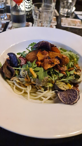 Voorgerecht: carpaccio van zalm. Een beetje zalm met een enorme berg sla. De scherpe rode ui en pittige rucola overstemmen de smaak van de zalm. Die al nauwelijks smaak had; het had alle schijn van een diepvrieszalm, die overigens zeer waterig was.