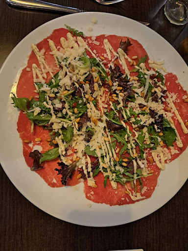 ย ย ย Read moreAfgelopen zondag met een groep van 8 gegeten, zie foto's. Mijn 1e keer. De anderen hebben volgens mij wel allemaal aardig gegeten, maar voor mij was t een tegenvaller. Vandaar ook de 3 sterren voor t eten. Flamkuchen, dit was een kleine pizza in puntjes, met daarop veel spread( iets in de trant van philadelphia) daarop een paar stukjes rode ui en zalm snippers. Voor mij was dit niet zoals een flamkuche hoort te zijn. Daarna had ik de salade met zalm en gamba's. Helaas was het geen koude salade. Er zat warme zalm en warme gebakken gamba s in. Na 3 a 4 happen ben ik gestopt. Ik had zin in een lekkere frisse salade. Maar dat was t zeker niet.