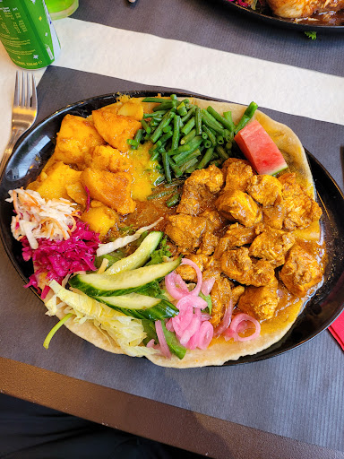 Ik kwam voor de roti, en daar ben ik al mijn hele leven gek op en ben ik kritisch mee. De laatste jaren krijg ik het niet meer voor elkaar om lekkere roti te kunnen kopen. Mijn vrouw maakt de perfecte thuis, maar dat lukt minder vaak dan dat ik het wil eten 😉. Deze was eindelijk voor herhaling vatbaar. De smaak zat er goed op, niet te nat en ze kleed het bord super leuk aan met garnering die ik nooit bij roti at, maar wel lekker is. Geen 4 sterren omdat ik liever kippendij dan filet heb (met bot vind ik weer niet lekker), het wat zoutig was en ik de madame jeanette liever al in de roti heb voor de smaak. Maar ik snap dat ze dit niet doet ivm koken naar iedereens mond, en niet iedereen eet pittig. De prijs vond ik overigens wel een beetje pittig voor roti, maar dat gaat overal omhoog lijkt het wel. Vraag of je de plaat er naast krijgt, anders is die wel nat omdat alles er dan op ligt. Kousenband kon ook beter.