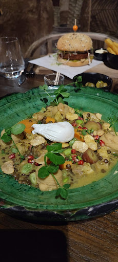 Als hoofdgerecht had mijn vrouw de kip uit de tajine met linzen, rode curry, zoete aardappel, peulvruchten, hummus, granaatappel en een gepocheerd ei.