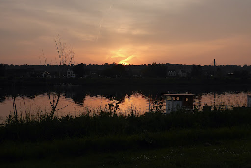 Greek restaurant with some rooms above with separate access up stairs (no lift). If you arrive early it may be closed with no-one there but there's a small bar opposite to sit and wait. Do not park on Diepstraat – it's reserved for locals with fines for others. Parking bays opposite side-door entrance to rooms are free but limited in number. Good sized room. Nice, freshly prepared breakfast. Evening meal in restaurant was generous and very good (Greek). Attentive, friendly staff – Nico welcomed us and spoke good English, explained all we needed to know. Maastricht is only 6 miles away and easy to get to by car or bike. Cross the river Meuse on the small (foot/bike) ferry for a hilly ride in on the Belgian side or stay on the Dutch side for an easy, flat ride in. Eijsden is a village with several cafés, bars, restaurants and shops/supermarkets. Far enough from Maastricht to be quiet and calm, close enough for easy access to the city or the countryside around. Photos: Sunset over the Meuse with the small ferry moored up. On the ferry – bikes and foot...
