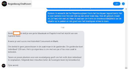 Naderhand heb ik de eigenaar benaderd om uit te leggen dat we de situatie betreuren, het gesprek wilde aangaan en graag het geld terug wilde hebben, aangezien de aanstaande bruidegom hiervoor had betaald. Op de foto (zie bijlage) valt de buitensporige reactie van de eigenaar af te lezen.