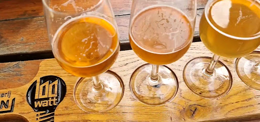 Stadsbrouwerij Eindhoven is a delightful craft brewpub, perhaps one of the most prolific in the Netherlands. They have about 14 house beers on tap, and another couple dozens available in bottles. It is a tremendous offering of variety, a beer lover's paradise. Thankfully they serve by the glass or smaller taster sizes so you can try a greater variety. These range from light and refreshing to heavy and intense. My favorites were their 400 Volt RIS (10% abv) and 3rd Anniversary DIPA (9%). The brewery was founded in 2014, and is located opposite their tasting room. They occupy part of a 2-story brick building with an industrial design. Outside along the street sidewalk is a long row of wooden tables overlooking a culvert stream. Their brewery is on the left, visible through a large doorway. Inside are brewing supplies and in the back are racks of barrels. The name of the brewpub is 100 Watt Cafe and there is a theme of electricity related names. The brewery's logo is a cityscape silhouette, which has been extended into a "100" logo inside a lightbulb for the cafe. The glassware, sampler trays and coasters all incorporate this lightbulb logo. As you enter the building from the street, their cafe / bar tasting room is on the right. It has a 12-chair wooden bar overlooking their glassware and stainless steel tap towers. Behind the bar the the left is a large window to their kitchen. Their delicious food menu consists of well prepared appetizers, salads, gourmet burgers, and specialty dishes of fish and meats. The place seems quite popular for dinner and drinks. Past the bar are high top tables, half-booth seating and dining tables. Pop background music competes with many happy conversations. The place has a high white ceiling and an interesting variety of lighting, creating a modern yet cozy ambience. The walls are decorated with chalkboards with various drawings. The staff is friendly and helpful, and I thought they did a good job. I would definitely recommend a visit (or more) to enjoy their great variety of beer and food. It will...