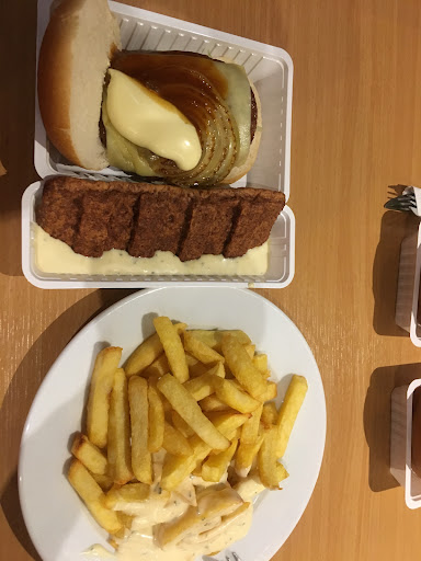 Niet veel later wordt ons eten netjes naar onze zitplek gebracht en kan het testen beginnen. Die frietjes smaken erg ‘droog’ en zijn geheel zoutloos, op onze tafel staat ook geen zoutpotje waardoor we deze zelf niet kunnen toevoegen. Later ontdekken wij dat deze binnen stonden, wellicht moeten we de volgende keer toch maar zelf initiatief tonen op dit gebied. De kipkorn is heel krokant en lekker van smaak. De bami, welke toch wel veel op een oriental leek, terwijl de uitbater aangaf deze niet te hebben, smaakte prima. De gehaktbal speciaal was lekker en kende de juiste afbaktijd. We brengen het dienblad met de lege bakjes netjes terug naar binnen en vervolgen onze autorit door...