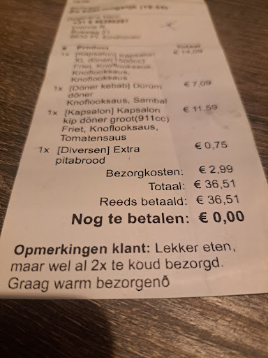 Gisterenmiddag eten besteld via thuisbezorgd. Na 2 uur nog geen eten te hebben gehad maar eens gebeld naar de zaak. Gezegd dat ik besteld heb en gevraagd wanneer ik het eten kan verwachten. Man zei dat ze na 1 uur voor mijn deur stonden en hebben gebeld maar niemand deed open-pakte de telefoon op en chaufeur is dus weg gegaan.Meneer was niet vriendelijk aan telefoon, begon gelijk op een bozige toon te roepen dat ik het maar met thuisbezorgd moet regelen. Thuisbezorgd gemaild en hun leken het op te nemen voor de zaak helaas na verschillende mailtjes over en weer.Geen eten gekregen en WEL betaald. Ik ga hier nooit meer bestellen. Ik hoop jullie ook niet....