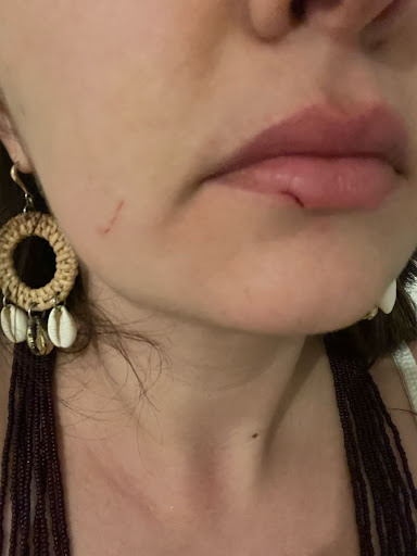 Yesterday, two men started fighting, and one threw a glass at the other's head. My friend and I were injured by the small pieces that flew away. I got pieces on my face and arm, and my friend got them on her back. She even had a piece in her eye, but luckily, after crying, it came out.