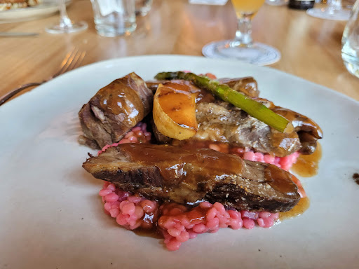 Omdat we beiden vegetarisch eten en ze slechts 2 keuzes vega hadden (afknapper 2,5) voor het hoofdmenu, besloten we ons te laten verrassen door het 3 gangen verrassingsmenu te bestellen. Bij ontvangst bleek dit voor zover we konden beoordelen hoofdzakelijk te bestaan uit gedeeltes van de andere gerechten, maar dan het dierlijke component weggelaten. Weinig verrassend dus. Afknapper 3. Verder wel smakelijk overigens.