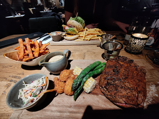 Na 1,5 uur nog geen hoofdgerechten. Navragen, geen terugkoppeling. Na nog weer wachten volgen ze dan eindelijk. Ook hier weer 10 min tijdsverschil tussen uitserveren gerechten op 1 tafel. Satésaus inmiddels ingeteerd tot plakkerige pindakaas. Gerechten staan veel te lang onder de warmhoudlamp in de keuken. Hamburger medium besteld, well done geleverd. Twee dure steaks (rood en medium besteld), komen well done op tafel. Retour naar de keuken. Hamburger wordt uberhaupt vergeten. Uiteindelijk geleverd, patat donker geel, 3x gefrituurd? Het vet druipt eruit! Terug naar de keuken. Na 5 min terug op tafel met uitgeslagen omelet op de hamburger, tussentijds lekker nagegaard onder de warmhoudlamp. Smakelijkheid vergaat je totaal!