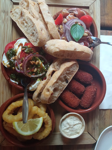 Read moreTapas erg tegenvallend. Flauw, niet lekker, weinig, en duur voor wat je krijgt. Jammer dat er meerdere kaarten zijn. Ik zag later pas de mogelijkheid voor een combinatie op de kleinere kaart, bovendien worden verschillende prijzen gehanteerd op kleine en grote kaart. Spareribs waren er niet, kaaskroketten waren er niet. Initieel het idee om meer te bestellen, maar na het proeven van de eerste tapas weggegaan en langs mcdonalds gereden. Quiche was bruin, te hard gebakken en droog, maar gelukkig slechts 2 hapjes groot. Aardappels waren gekookt en in vet gegooid met verbrande thijm, de rozemarijn was ver te zoeken. Calimaris waren deegballen met smeuïge inktvis erin, had weinig met verse Spaanse calamaris te maken eerder hollandse snackbar inktvis. Chorizokroketjes leken op mora hapjes, weinig smaak alleen wat chili op het eind. Champignons waren saai maar wel oke. Na een teleurstellende eerste ronde aan tapas, toen maar gestopt.
