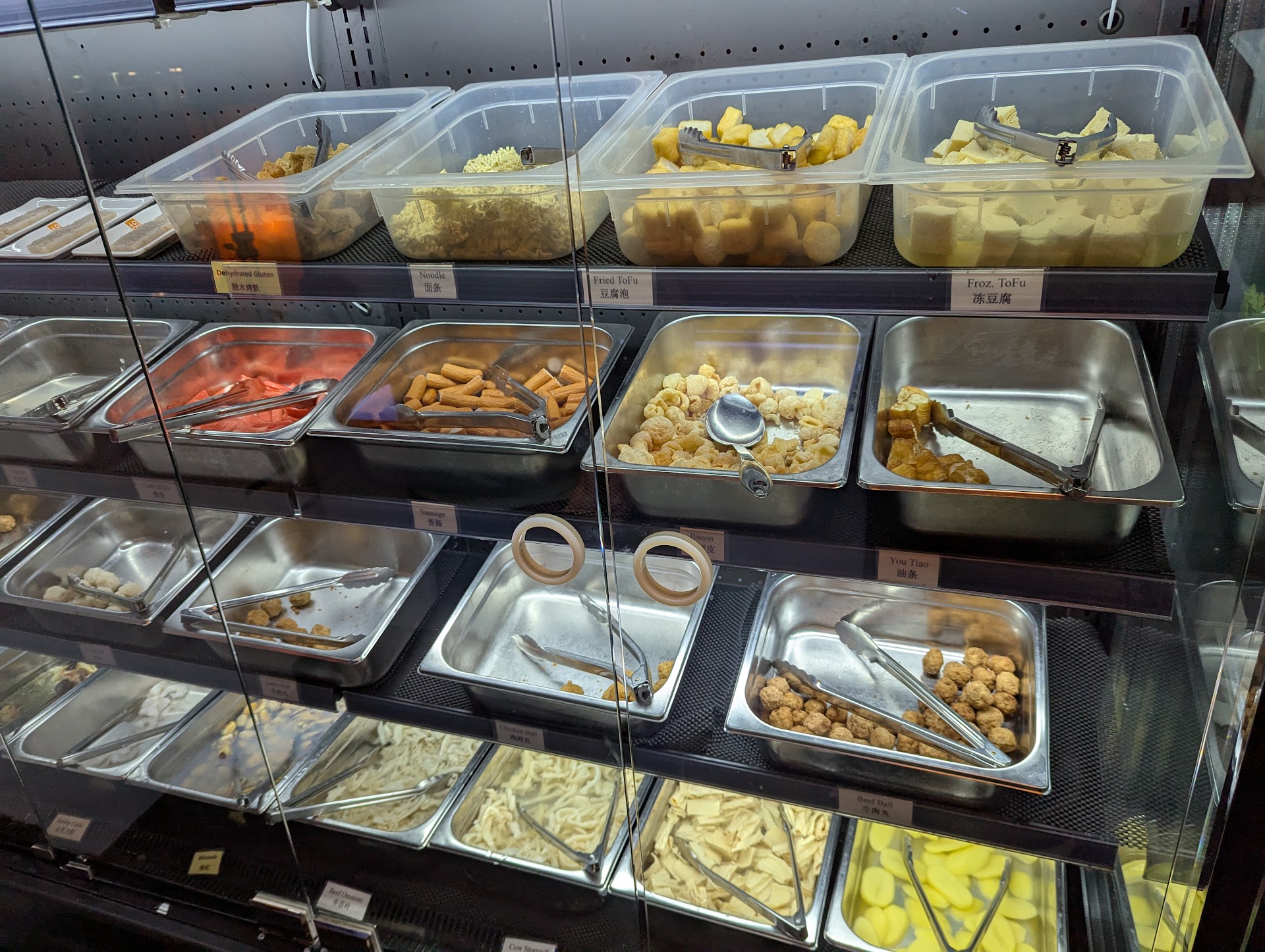 Das Gemüse und Fleisch nimmt man sich dann vorne aus dem Kühlschrank quasi wie im Supermarkt. Es gab eine große Auswahl verschiedener asiatischer Gemüse und Pilze wie Pak Choi, Kohl, Enoki, Kräuterseitlinge, Tofu, Udon, Glasnudeln, Reiskuchen... Dazu dann Fleischbeilagen wie Garnelen, Wan Tan, Fischstücke und eine Truhe mit dünn geschnittenem Rind, Lamm, Schwein und Hähnchen. Außerdem noch eine Saucen-Station mit verschiedenen Pasten wie Chili-Knoblauch, ShaCha, Hoisin, Bohnenpaste und frischen Zutaten wie gehackten Knoblauch, Chilis oder Koriander zum selber mischen.