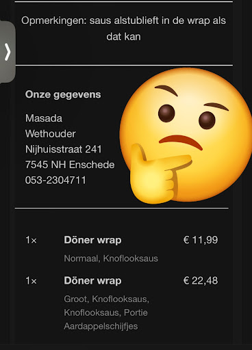 De eerste keer via de app besteld en nagebeld om er een dönerbox bij te krijgen maar heel moeilijk doen...uit eindelijk wel gekregen.