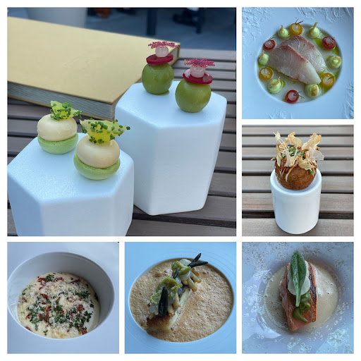Voorafgaand hadden wij als starter een Aziatische oester gekozen, deze was zeer hoog van smaak en zeer fris. Een aanrader voor wat mij betreft, een foto van de oester is bijgevoegd. Na de verschillende Amuses begon onze eerste gang, dit was de Forel met Granaatappel, dragon en Groene appel, een zeer fris gerecht wat hoog op smaak is, het is bijna zonde op het op te eten.